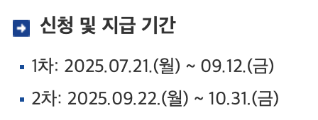 1차 신청 기간은 2025년 7월 21일(월) 오전 9시부터 9월 12일(금) 오후 6시까지입니다. 2차 지급은 9월 22일부터 10월 31일 사이에 진행되며, 소득 상위 10%는 제외됩니다.
