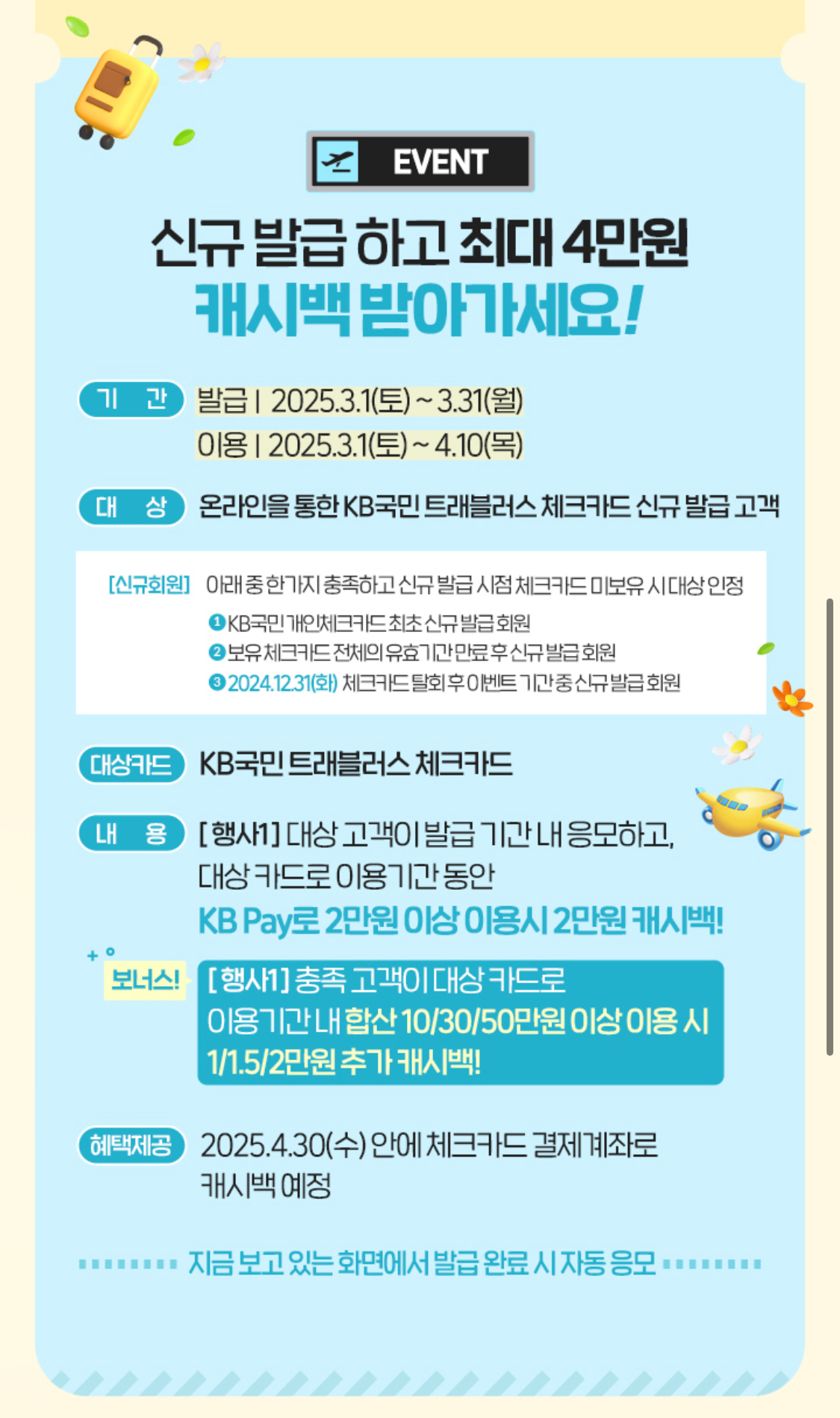 KB국민 트래블러스 체크카드는 신규 발급 고객을 위한 다양한 프로모션도 제공하고 있습니다.