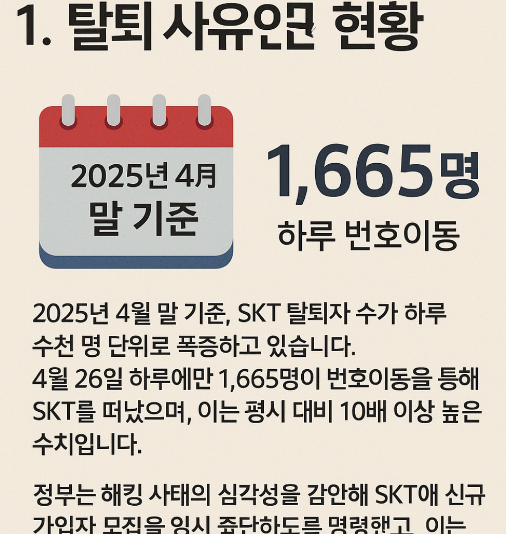 2025년 4월 말 기준, SKT 탈퇴자 수가 하루 수천 명 단위로 폭증하고 있습니다. 4월 26일 하루에만 1,665명이 번호이동을 통해 SKT를 떠났으며, 이는 평시 대비 10배 이상 높은 수치입니다.